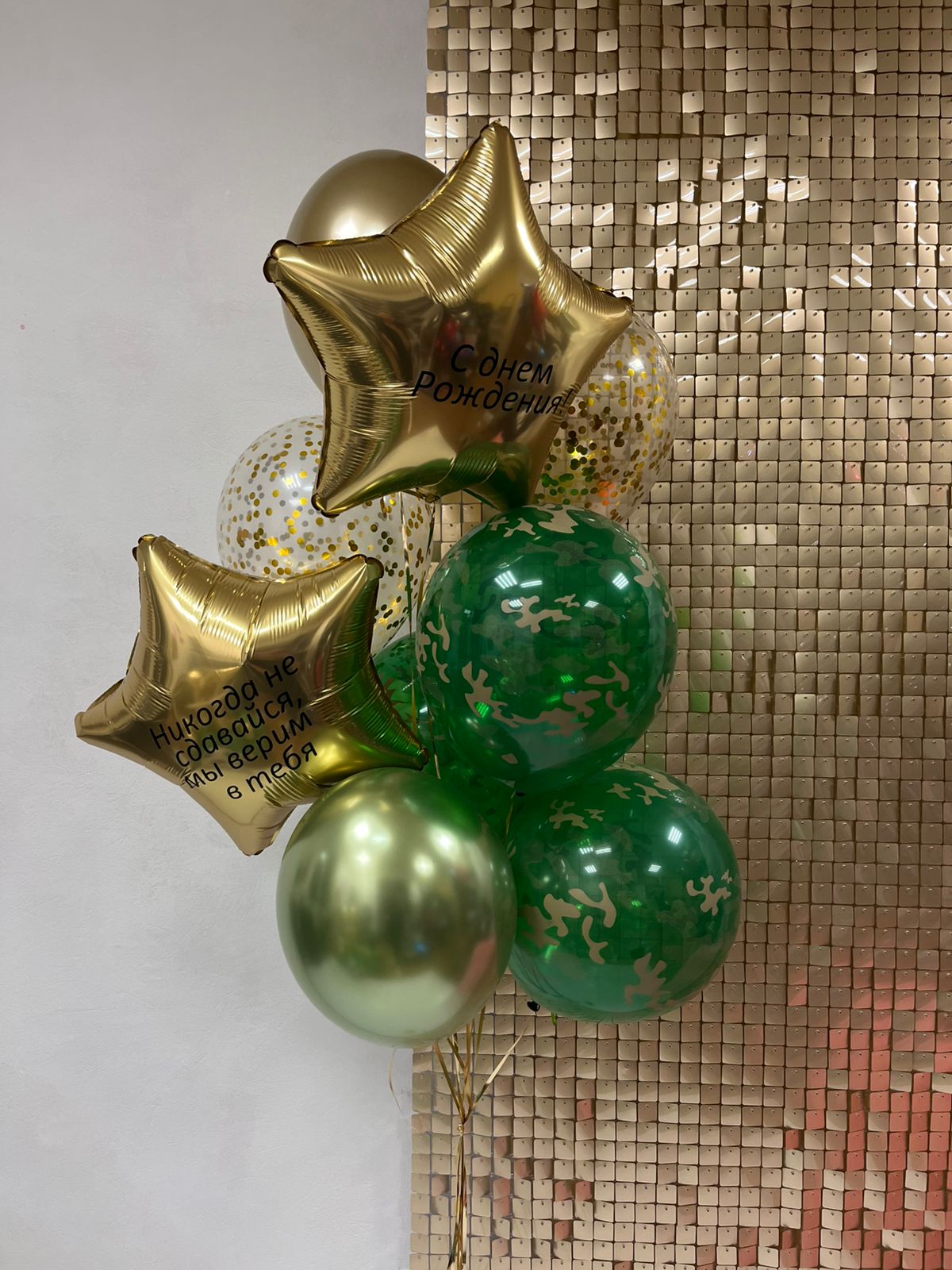 - 3 латексных шара, 2 шара с конфетти, 2 шара хром, 2 фольгированные звезды ( надписи на звездах)