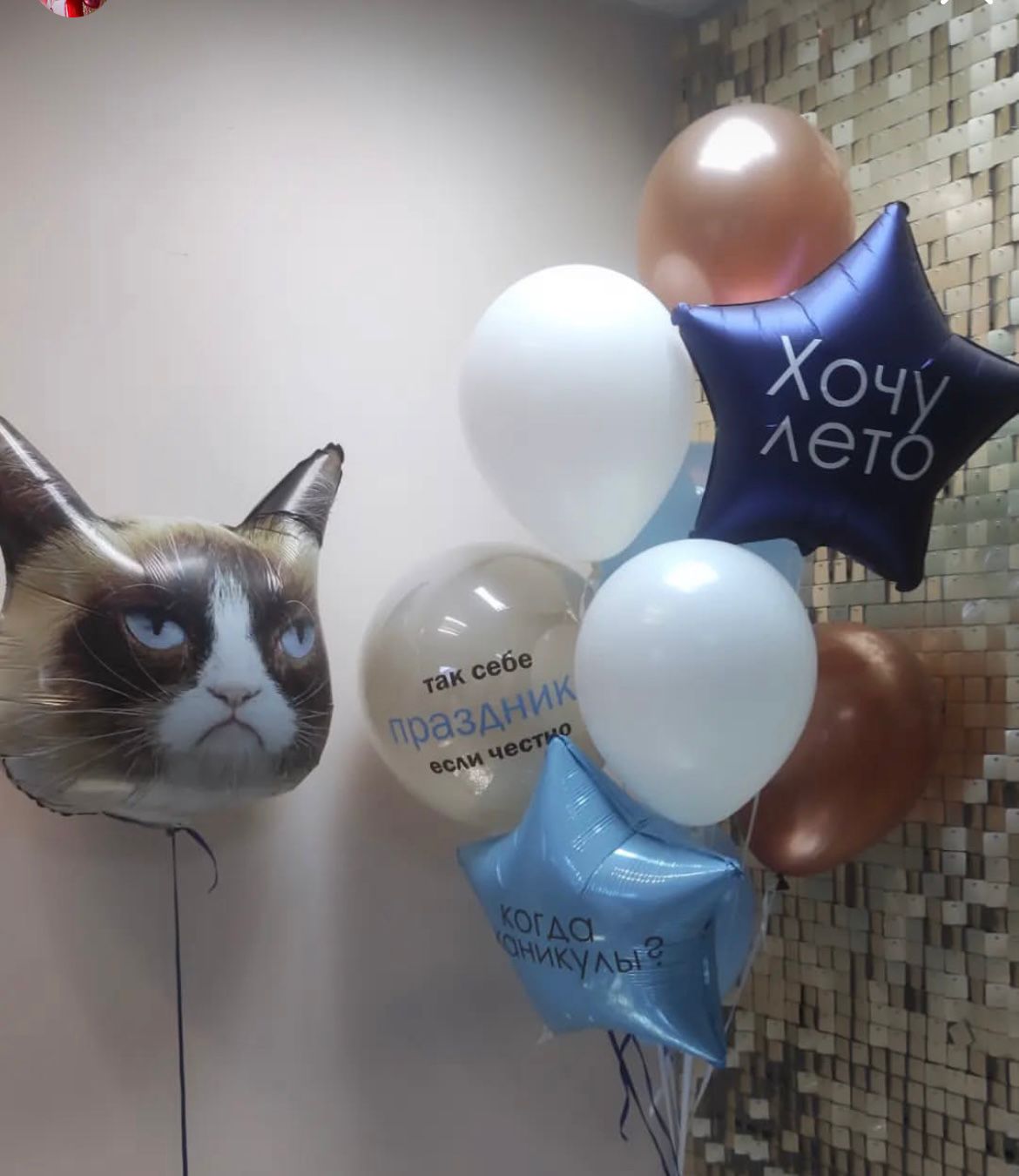 - фонтан 2 фольгированные звезды с надписью, 6 латексных шаров. 1 зеркальный шар с надписью)